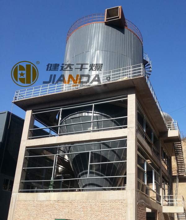 干燥介質(zhì)空氣經(jīng)過(guò)直燃式天然氣熱風(fēng)爐加熱后,通過(guò)高溫亞高效過(guò)濾器過(guò)濾后,經(jīng)由干燥塔頂部的熱風(fēng)分配器進(jìn)入塔內(nèi);需干燥的物料由高壓泵送入塔頂噴槍?zhuān)趬毫Φ淖饔孟滦纬杉?xì)小的霧滴。在干燥室內(nèi)熱風(fēng)與霧滴群接觸水分蒸發(fā)干燥成干粉,干粉通過(guò)主塔及二級(jí)旋風(fēng)分離器收集。