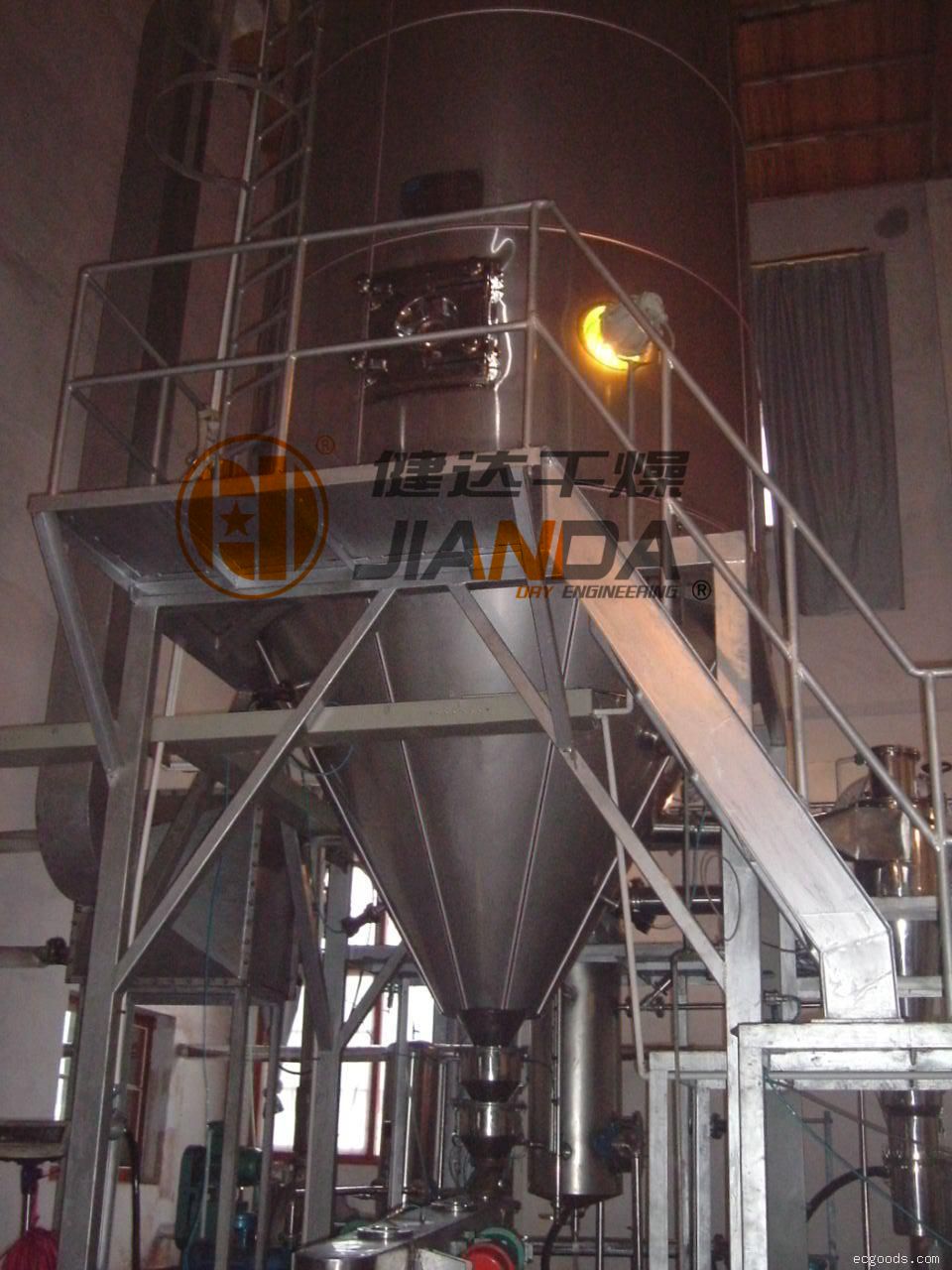 壓力噴霧干燥 一種比較好的方法是將純化的麥芽糊精初蒸濃縮液經熱交換器加熱到110 ℃,用高壓泵經噴嘴噴入干燥室中與150-200℃的熱空氣接觸干燥到水分含量3%以下,得到白色粉末,這種產品易溶于水,透明度高。設備描述 壓力噴霧干燥機可以使溶液、乳液、懸浮液、糊狀物料噴霧干燥成顆粒干粉,速度快效率高工序少。對于熱敏性物料,可保持物料的色、香、味及溶解性。整個系統采用熱風介質開式循環物料并流的方式干燥,生產環境好,能基本實現自動化操作。壓力噴霧干燥機廣泛應用于有機及無機化工物料、樹脂及乳膠、蛋奶制品及食品、醫藥、陶瓷及電子材料。